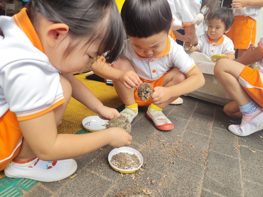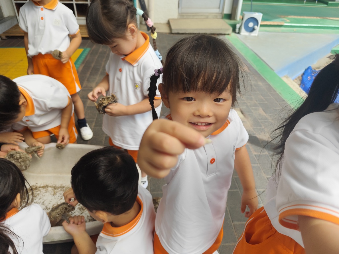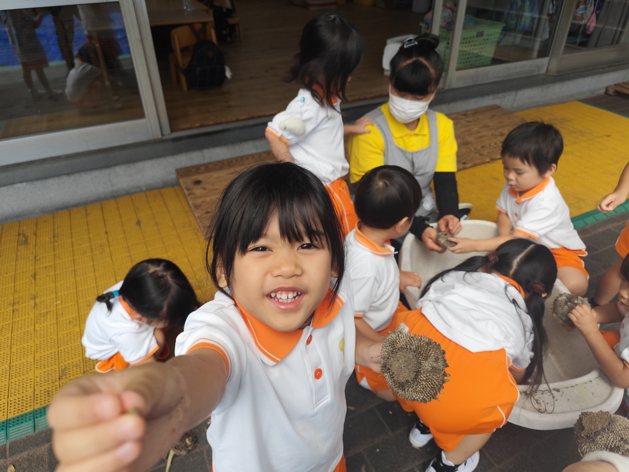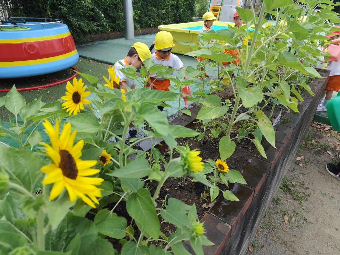 年少組で5月に植えたひまわりの種。成長を観察したりお水をあげたりとたくさんお世話をしました。7月には花壇いっぱいのひまわりが咲き、咲いた喜びを友達や先生と一緒に共有しました。そして先日、枯れたひまわりから種の収穫をしました。想像以上のたくさんの種に、子どもたちは驚いていました。収穫した種は一人一人お持ち帰りもし、季節を通して様々な経験をすることができました。