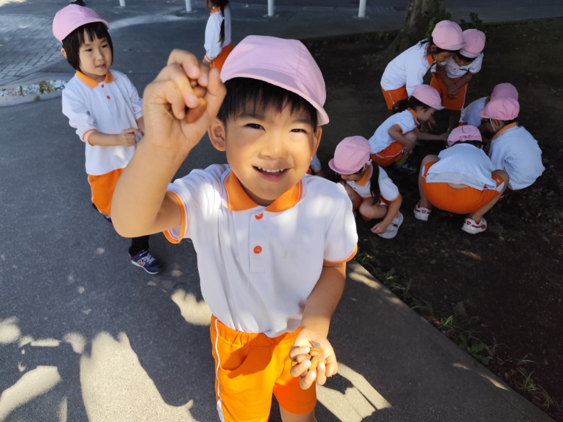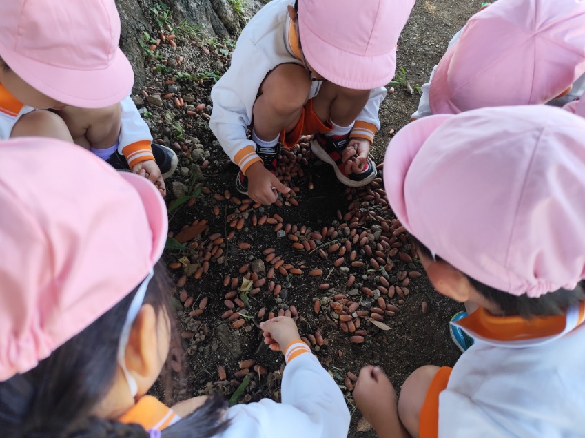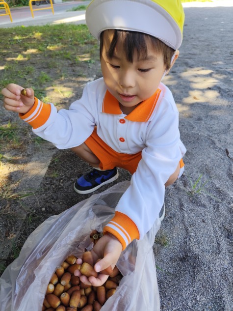 秋晴れの日、年少組と年中組の子どもたちは近くの公園へどんぐり拾いにいきました。いろいろな形、大きさのどんぐりを見つけ、嬉しそうに教えてくれました。どんぐり拾いの後は、公園で楽しく遊びました。年少組さんも最後まで元気に歩くことができました。