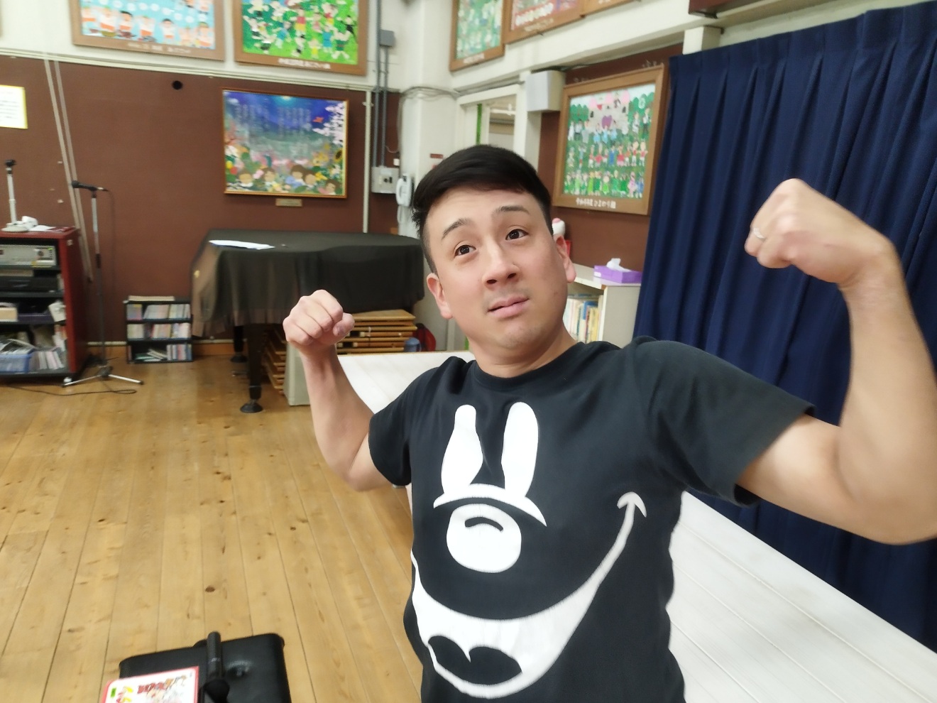 年中組は戸外が雨で遊ぶことができなかったので、遊戯室にみんなで集まってダンスをしていました。思い切り体を動かすことができたようで、職員室まで子どもたちの嬉しそうな声が聞こえてきました。遊戯室を覗きに行くと子どもたちの笑顔がたくさんの中、先生が一番張り切って踊っていました。