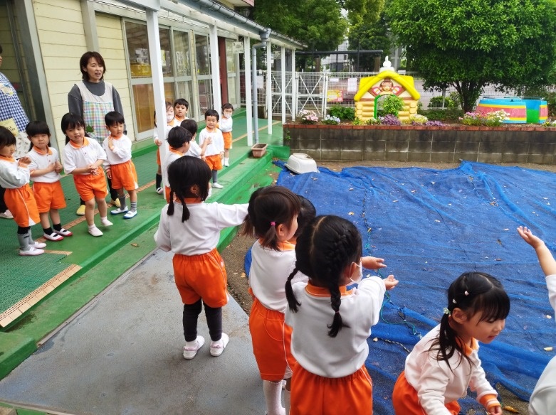 雨の日、年少組さんをふと覗いてみると、みんなで雨の音を聞いていました。耳を澄ませる姿はとてもかわいかったです。また、屋根から落ちる雨粒を楽しそうに見ていたり、受け止めようと、手でお皿を作ったりと雨の日ならではの楽しい活動をしていました。
